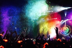 Alas, it was show time. After not so tolerantly waiting through not one, but two, unremarkable opening acts, I felt my chest begin to pound as I nervously adjusted my precious Xyloband, still waiting for it to come alive. Just when I thought I couldn’t wait another minute, the concert hall precipitously filled with Maria Callas’ operatic voice as “O Mio Babbino Caro” echoed within the walls. Then, as the lights went out, the screens lit up with greetings from attendees of the previous show in Chicago, as they sent their regards and introduced “the greatest band in the world…Coldplay!” Suddenly, a collective roar erupted and music began to pour out from the amp stacks. Thousands of Xylobands concurrently ignited the darkness creating a sparkling sea of red and white pulses. Will Champion, Guy Berryman, and Jonny Buckland took their places on stage as an exuberant Chris Martin leapt onto a multi-colored runway encompassing half the venue’s floor section. The foursome opened with the effervescent title track from the band’s seventh album. It was a high-energy opening that climaxed with multiple canons firing a cornucopia of rainbow colored confetti upon the cheering crowd.